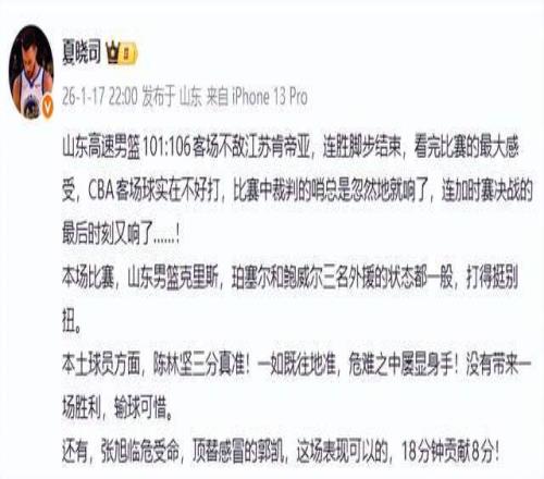 作为山东媒体人,夏晓司老师是会这样说的,“看完比赛的最大感受,CBA客场球实在不好打,比赛中裁判的哨总是忽然地就响了,连加时赛决战的最后时刻又响了……”显然,他觉得是裁判的问题。