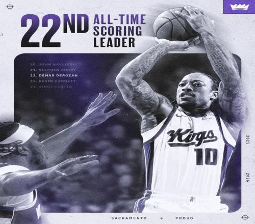 此役,德罗赞还创下了纪录。得到本场第22分之际,德罗赞生涯总得分也是超过名宿凯文加内特升到历史第22位。