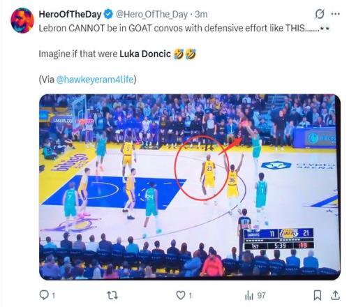 首节詹姆斯打8分钟,3中2+三分2中1拿到5分1篮板0助攻1抢断1盖帽,但他有一个目送对手三分命中的瞬间,詹黑媒体立马炮轰:詹姆斯绝对不该以这样的防守态度去评选最佳球员,试想如果是东契奇这样漏防会是什么风评?