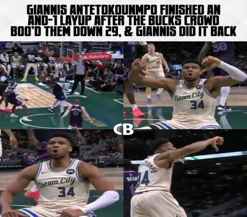 那场比赛半场结束球员回到更衣室时,字母哥被主场观众狂嘘,一点面子都不给。下半场回来字母哥打成一个2+1之后,字母哥坐在地上对着主场的球迷嘘了回去,同时两个大拇指朝下,以眼还眼以牙还牙。