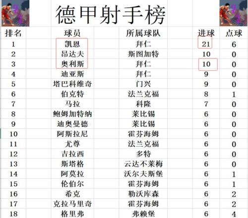 积分榜方面,拜仁和多特本轮都赢球,拜仁就还是领先多特11分稳稳领跑。莱比锡两回合被拜仁狂灌11球,今天被逆转惨败后,他们已经是落后拜仁18分之多,赶上来基本是不可能了,而且霍芬海姆再争四关键战中击败勒沃库森,1分又是超过莱比锡升至第3。